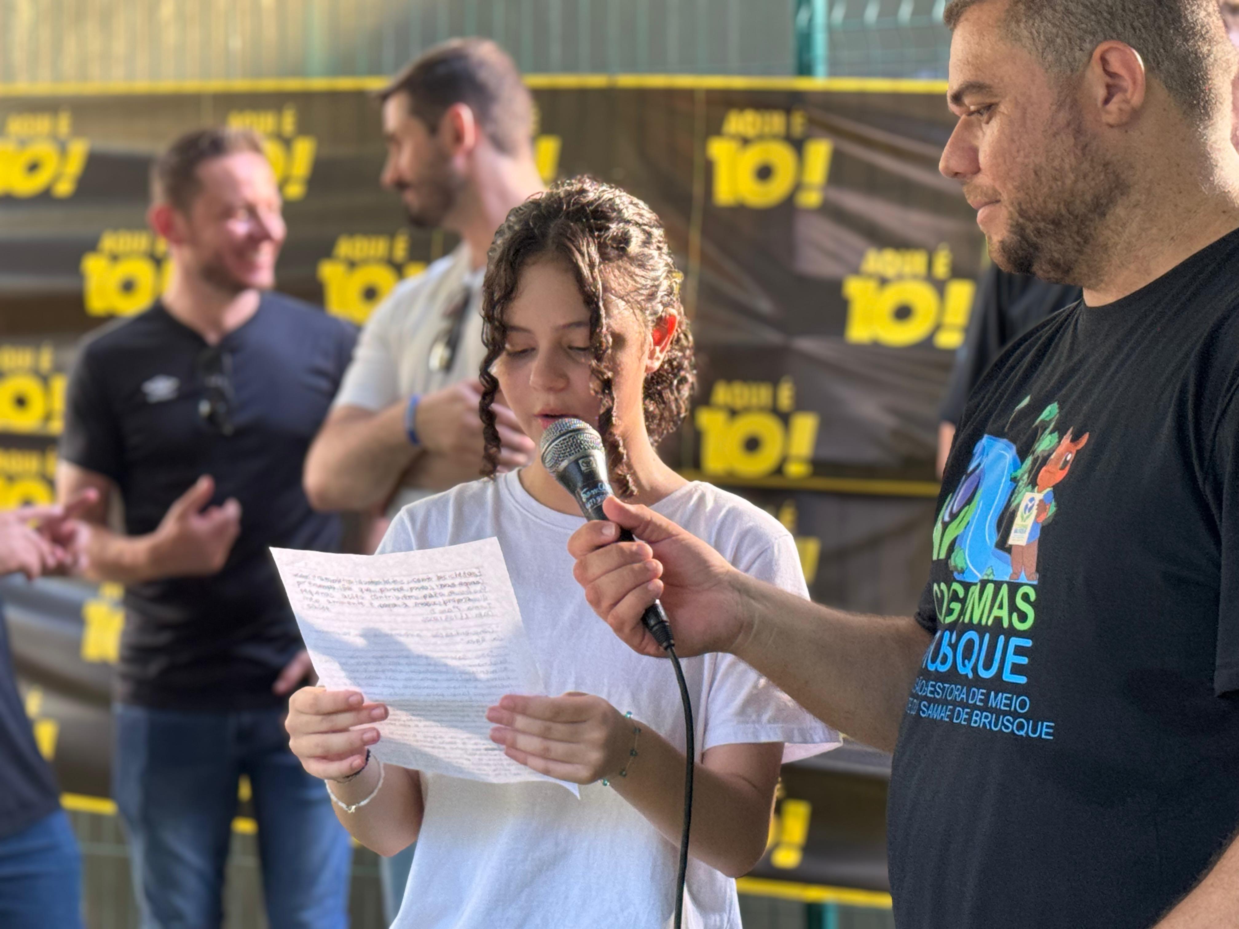 Na sequência, o prefeito de Brusque, André Vechi, o vice-prefeito Deco Batisti, o presidente do Samae, Rodrigo Cesari, o presidente do Cogemas, André de Castro, e o vereador Antônio Roberto foram convidados a realizar a entrega das premiações das melhores redações, produzidas durante a Semana da Água.